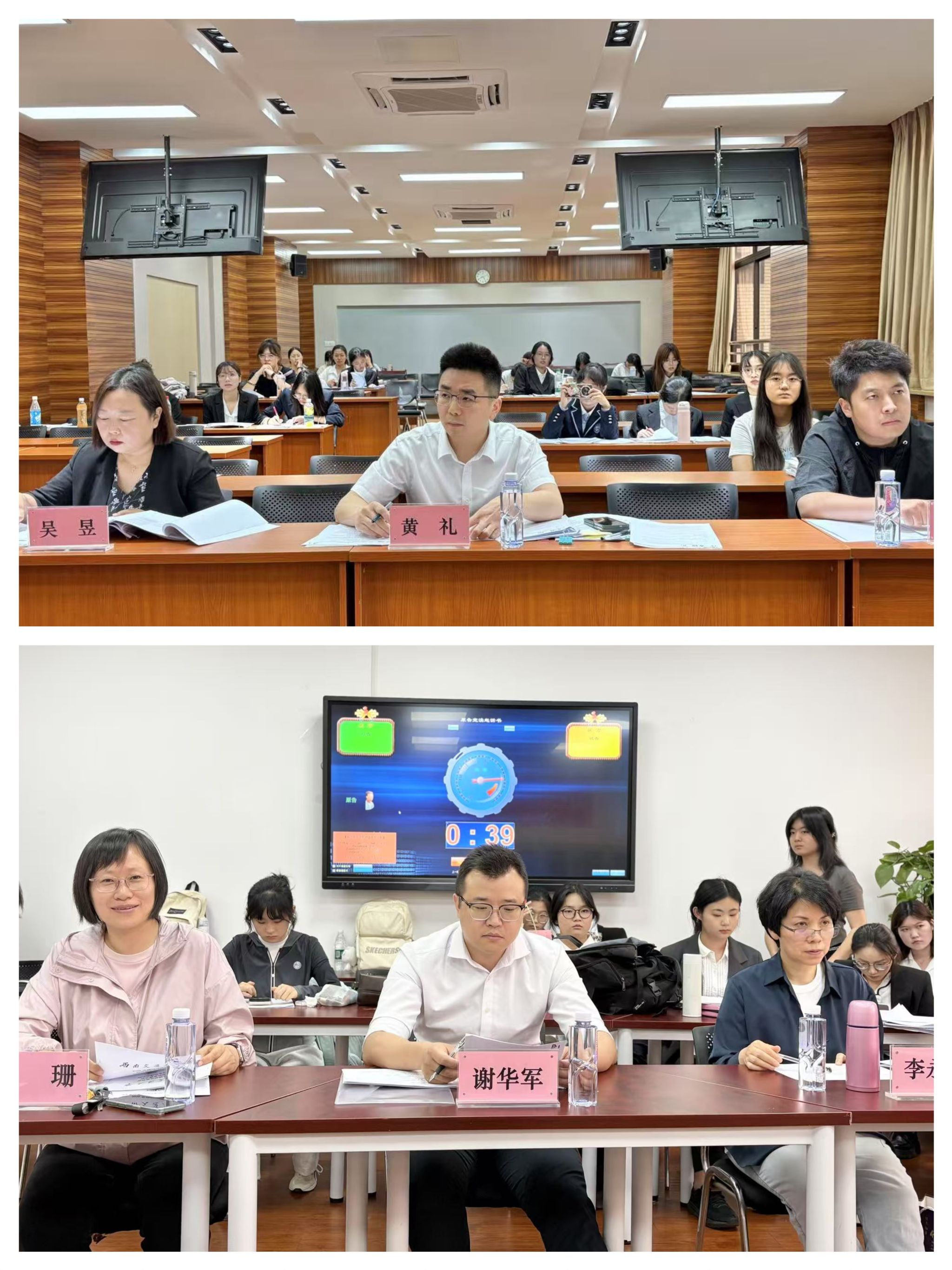 本次竞赛案例由成都市青白江区人民法院提供,初赛阶段通过司法文书评审,有8支参赛队伍凭借出色的文书撰写能力从17支参赛队中脱颖而出,晋级复赛。复赛分为A、B两组,分别在01417和01101进行循环对抗赛。本次竞赛组委会特别邀请了拓泰律师事务所高级合伙人黄礼和拓泰律师事务所桃园律师合伙人谢华军作为评审主席,法学系副教授吴昱、张敖、李永泉、杨珊等六位老师作为本次竞赛的专家评审团,为两组赛事分别进行专业评审。