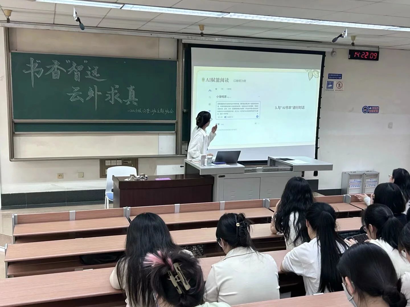 4月24日,公共2023-02班精心筹备并开展了以“书香‘智’远,云外求真”为主题的班会活动。在开场“卷中求索”环节,同学们化身为知识的传递者,通过互荐书籍和分享读书笔记,尽情展现阅读的深度与广度。大家借助生成式人工智能技术制作思维导图与阅读笔记,进一步深化了对书籍的理解。在“智构鸿图”环节,同学们充分运用AI赋能经典作品以新的形象与表现形式。在“智启未来”环节,徐换歌老师与徐梦莹老师的点评和指导为同学们照亮了阅读与成长的道路,让大家对未来的学习与探索充满了信心。最后的“尘封书韵”环节,师生们将自己最喜欢的书籍、阅读感悟,以及触动心灵的话语认真写在纸上,随后将它们封存于瓶中,留待未来的某一天开启。那时,大家或许早已踏上不同的人生旅程,但再次翻开这些文字,必将感受到时光流转中心境的奇妙变化,重温阅读带来的温暖与力量。