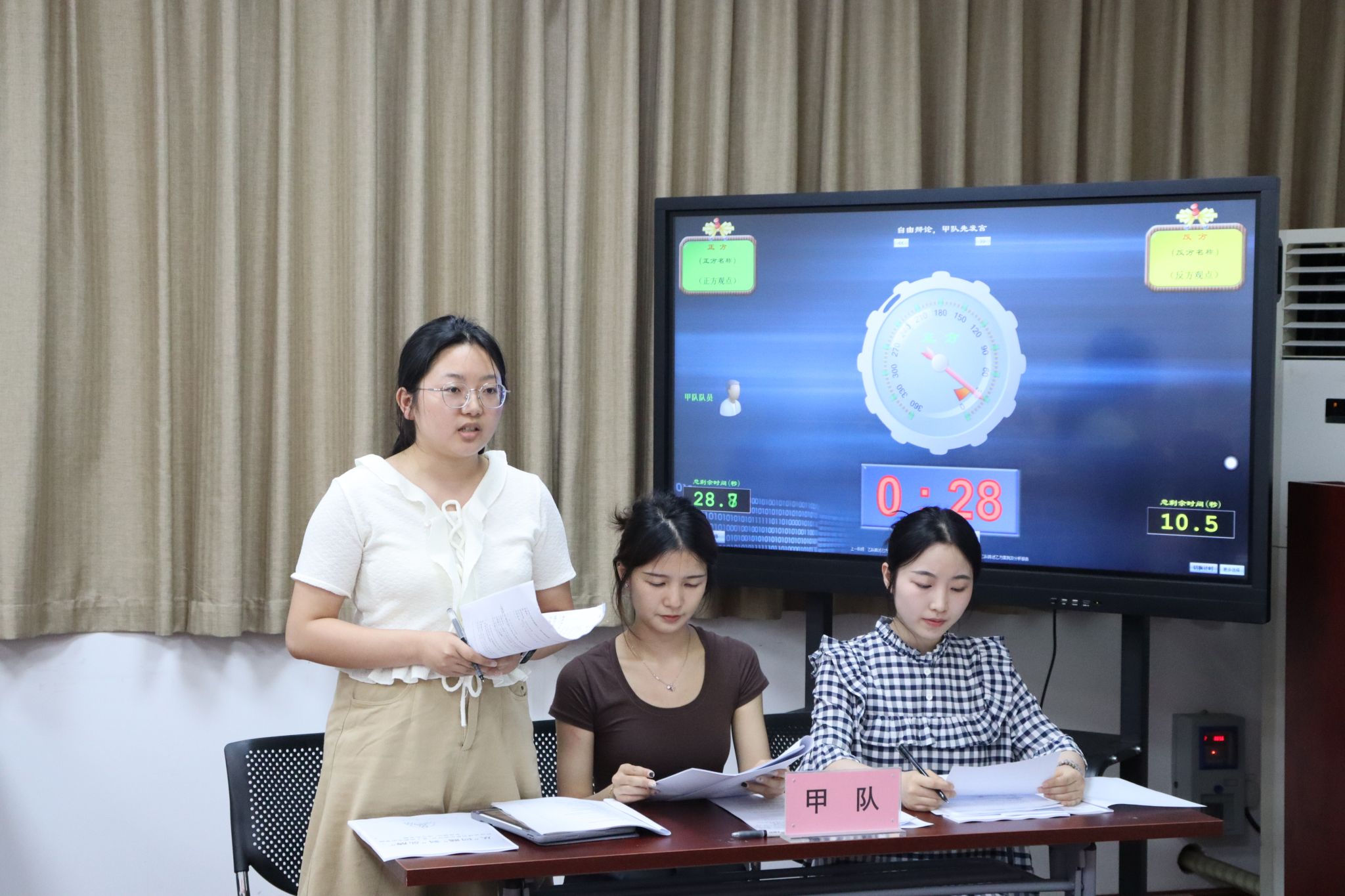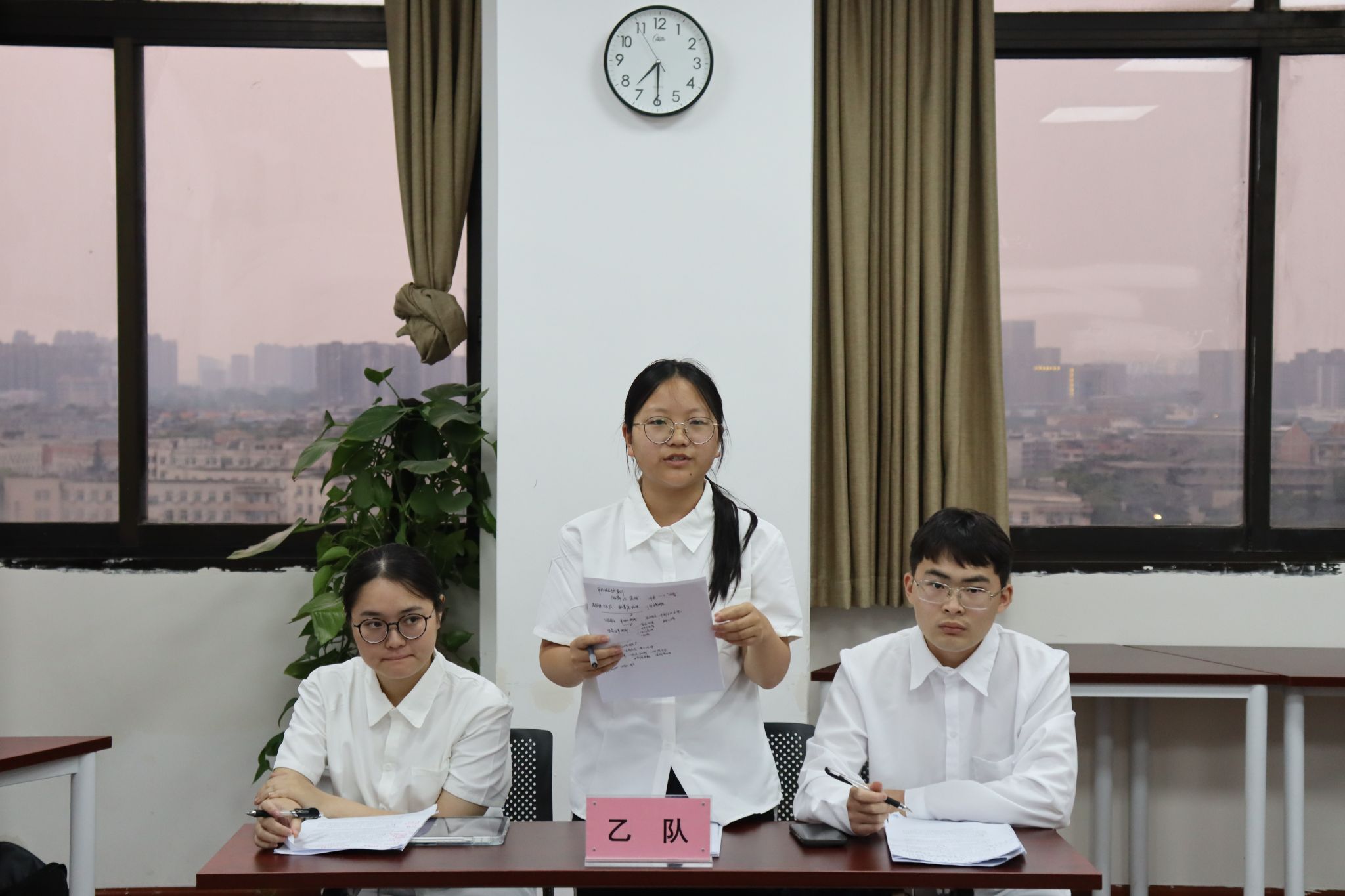 与此同时,在J01108分赛场中,比赛也在激烈地展开。在第一场比赛中,“凡事不能太绝队”以成都市武侯区金雁社区为例,探讨了全过程人民民主嵌入基层治理的过程。接着,“自由民”以沙河源健康小屋为例,阐释了积分制推动基层健康治理的机制过程。在第二场比赛中,“蝶变行动组”论述了价值共创如何促进成都市金牛区老旧小区老八栋改造,展现基层共治共建共享的治理智慧。而“三维魔方组”针对其案例的推广性、问题解决方式角度进行质疑,“蝶变行动组”也做出一一回应。紧接着,“三维魔方组”针对大型社区翡翠城的治理困境,提出3D化解工作法,以党建引领创新,实现从被动应对到主动治理的转变。四支队伍、两场比赛的辩论环节,有理有据,据理力争,选手们运用专业素养,敏锐捕捉到对方的不足,一针见血,触其本质。