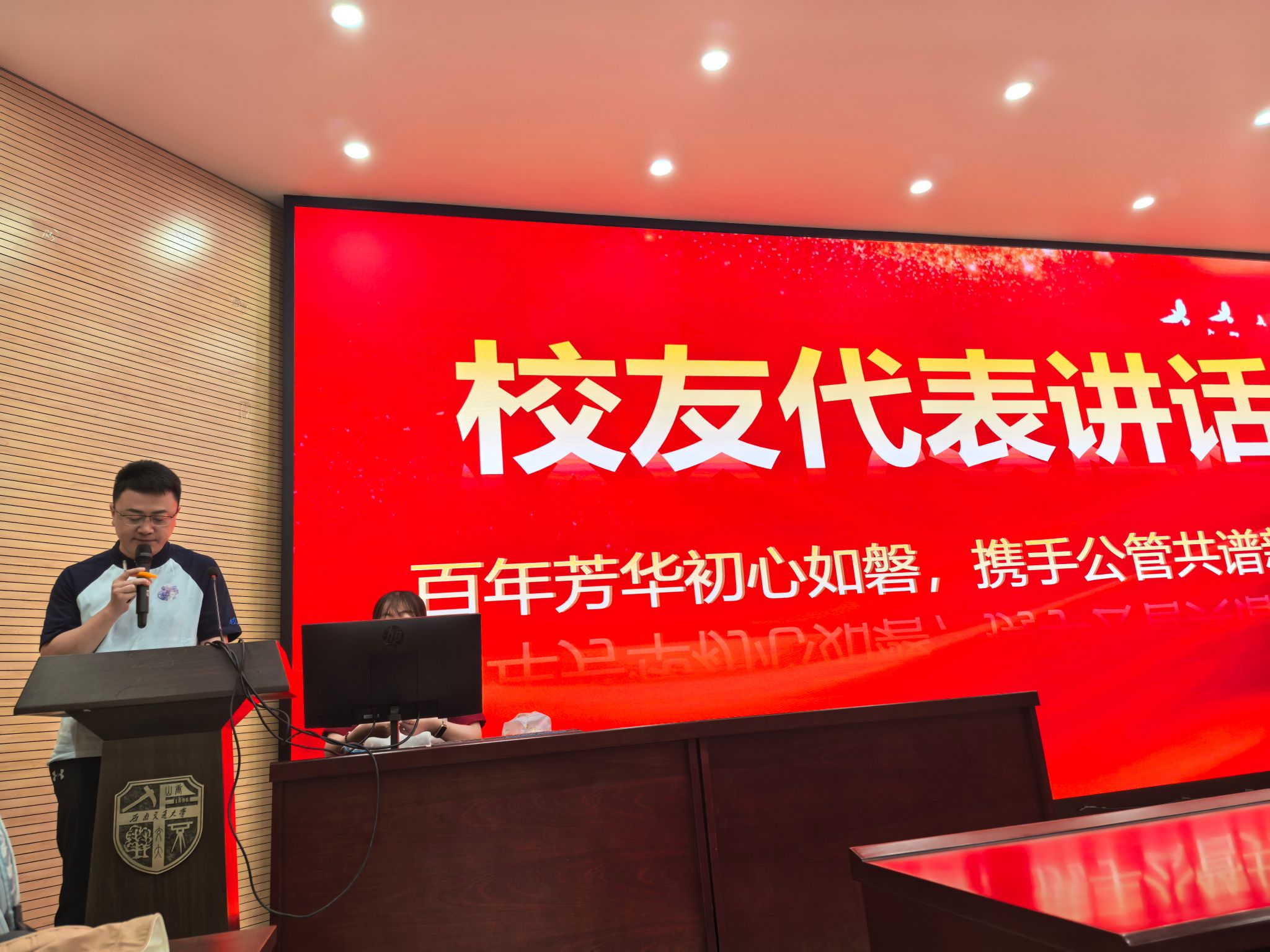 典礼上,彭川宇副院长代表学院致辞,向跨越十六载重返母校的2008级MPA校友致以诚挚谢意与深切祝福,并寄语全体交大人传承“天下为公”精神,共绘新时代发展蓝图。随后,来自中国移动铁通四川分公司 综合部总经理/党委办公室主任,MPA2008级班长陈丰学长作为校友代表发言,并率2008级校友集体朗诵原创诗歌《MPA学子的时光胶囊》,诗歌以“公心为政”为主线,将校友们公共管理领域的躬耕实践与求学时光中的梧桐光影、学堂钟声交织呈现,抒发了对母校的深切眷恋。当全场齐诵“大道之行,天下为公”的铿锵誓言时,十六载未变的母校情谊跨越时空,令在场师生动容。