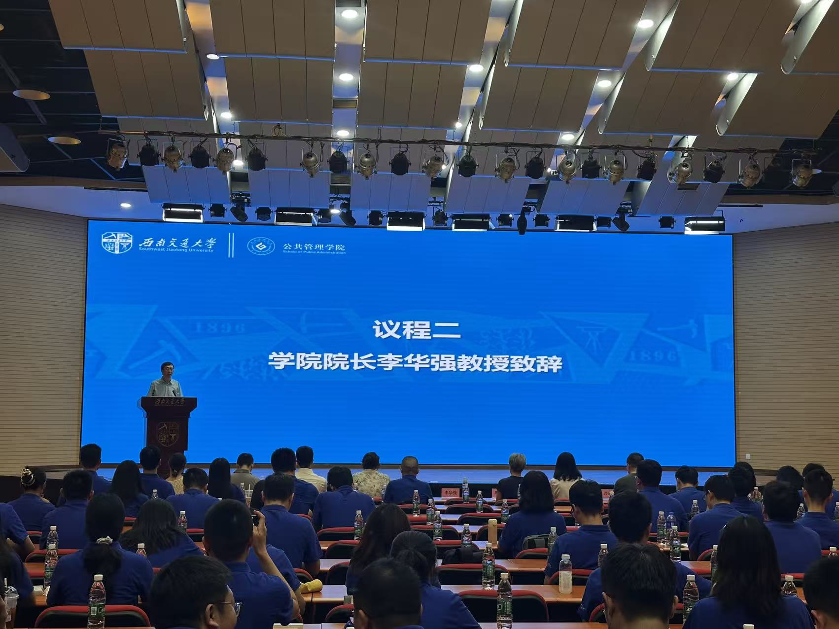 学院院长李华强教授代表学院致辞,李院长首先代表学院向2025级MPA新生表示热烈欢迎,并勉励同学们充分利用校内外优质资源,深化理论学习与实践能力。李院长对新生提出四点期望:胸怀大局、志存高远;勤学善思、勇于创新;团结协作、互学共进;坚守初心、勇担使命。他祝愿全体新生在西南交大收获充实精彩的研究生时光,也期待见证大家的成长与突破。