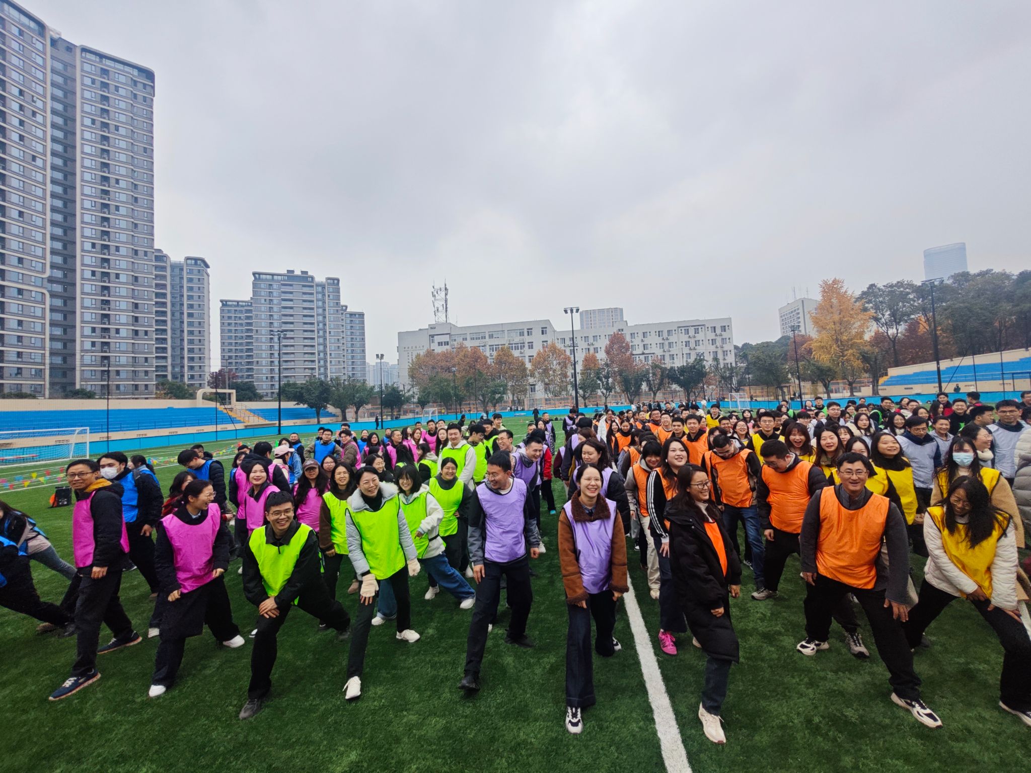 活动伊始,专业教练带领全体师生进行热身活动,动感的节奏和整齐的动作迅速驱散寒意,也让现场气氛持续升温,欢声笑语中,运动会在师生合影后正式拉开帷幕。