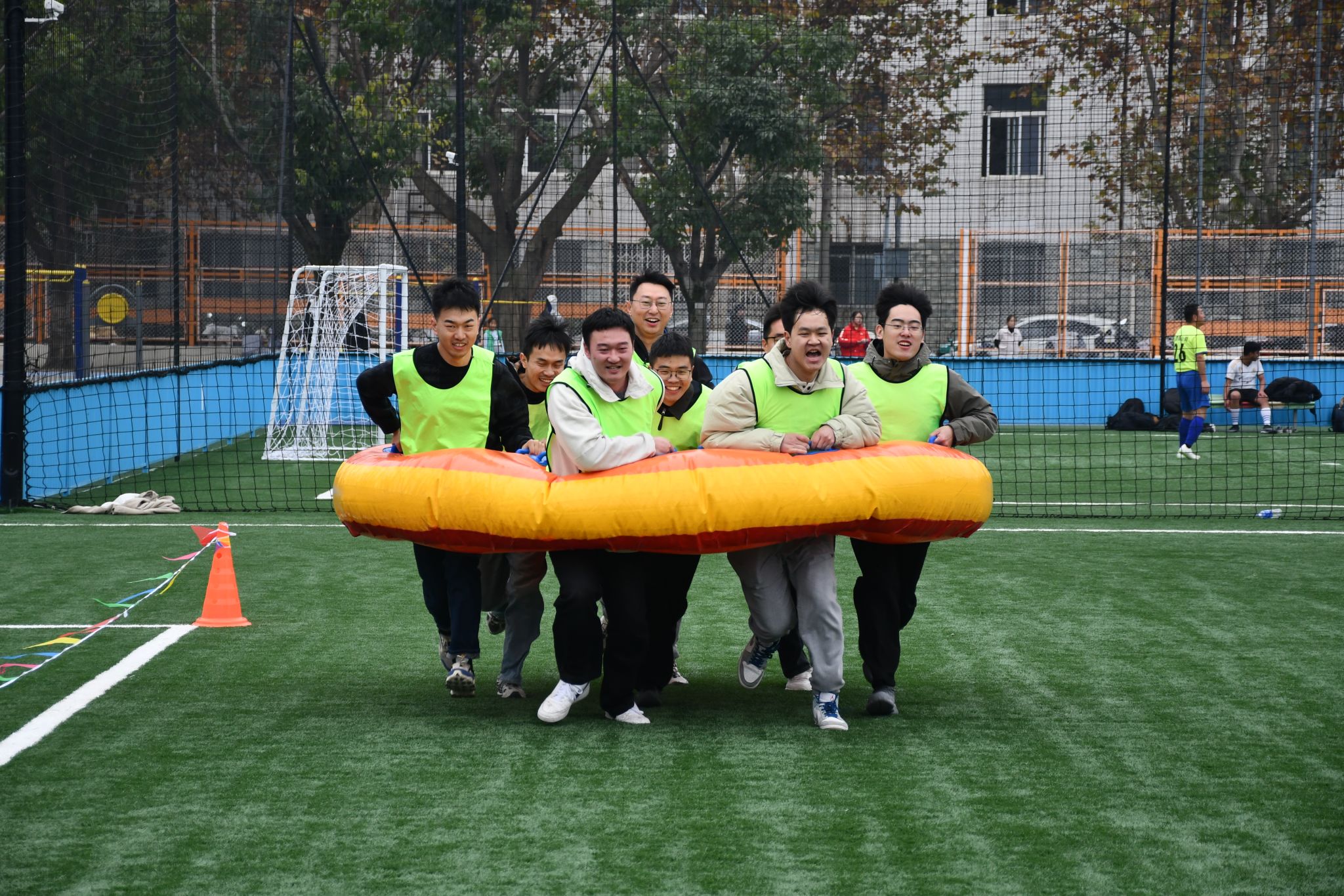 “虎步龙行”将气氛推向小高潮。队员们骑上龙形道具,协同控制方向,推动龙头部位的大球平稳向终点前进。“长龙”蜿蜒前行,师生步调一致,在默契配合中体验着并肩作战的快乐。