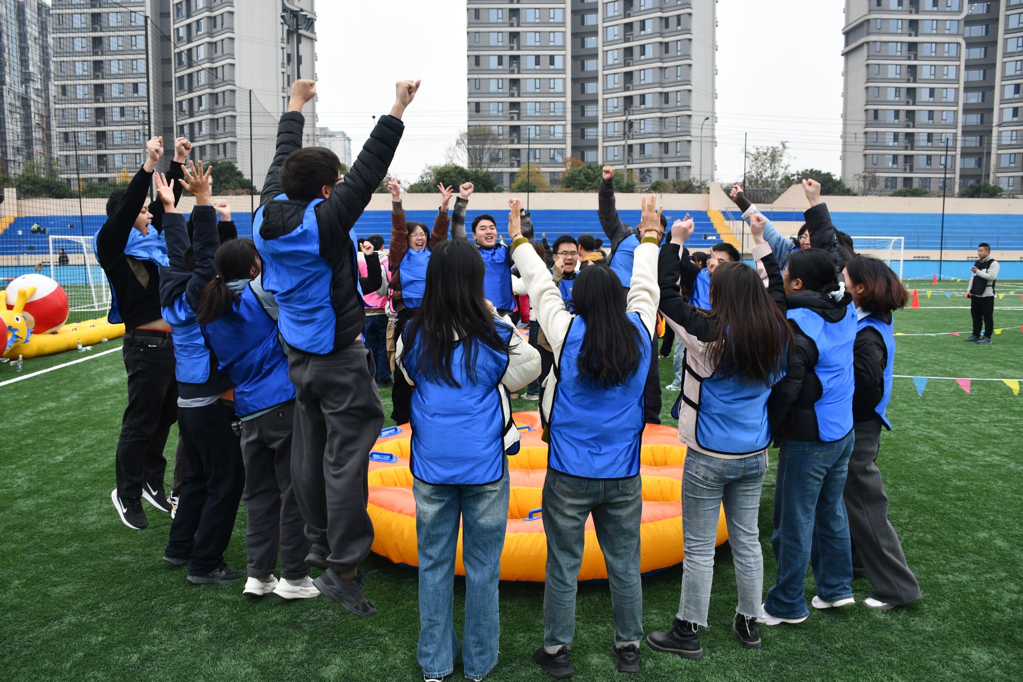 “八仙过海”项目趣味与挑战并存。队员们钻入充气道具,以折返绕桩接力完成比赛。各队赛前积极商讨策略,比赛中或稳或疾,即便偶有失误也迅速调整,展现出团队的应变能力与协作智慧。